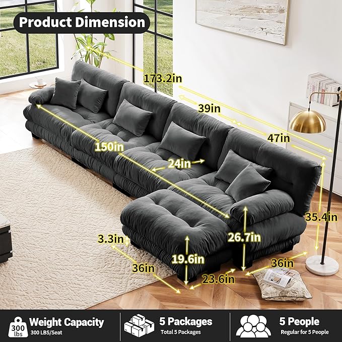 - Oversized L-Shaped Couch: This is a modern sectional couch with an ottoman. The 4-seater sofa couch is made of soft, durable, and exquisite vintage chenille fabric, it offers comfort and soft seating for everyone sitting on it. Exquisite round bolster armrest designs with well-filled inside provide comfort support for the hands, while sitting on it the bolster armrest can also provide your head with the appropriate radian and support