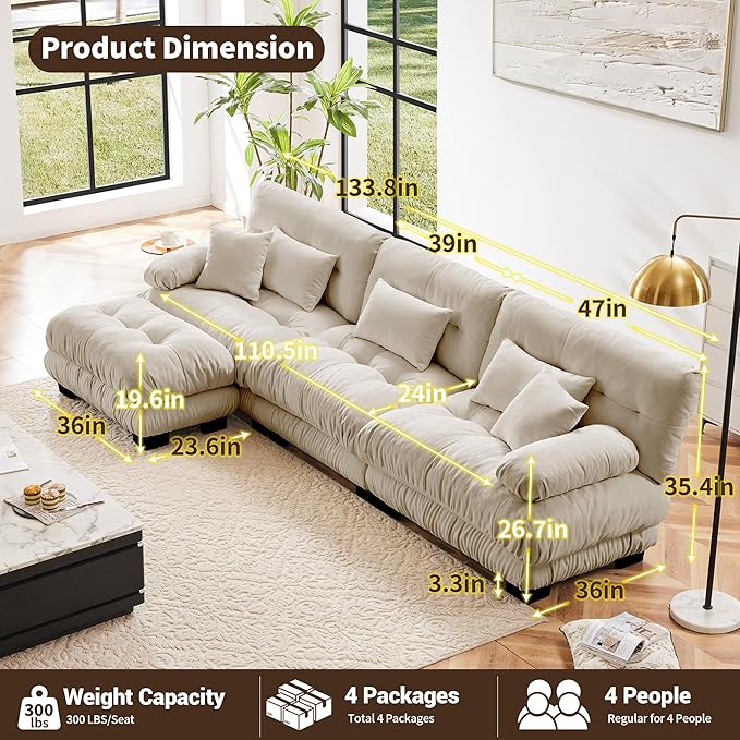 - Oversized L-Shaped Couch: This is a modern sectional couch with an ottoman. The 3-seater sofa couch is made of soft, durable, and exquisite vintage chenille fabric, it offers comfort and soft seating for everyone sitting on it. Exquisite round bolster armrest designs with well-filled inside provide comfort support for the hands, while sitting on it the bolster armrest can also provide your head with the appropriate radian and support