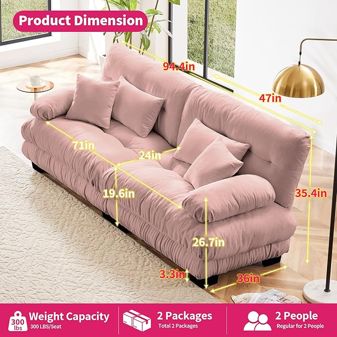 Loveseat Modular Sectional Sofa, Cloud Couch 2 Seater Sectional Couch Home Sofa Living Room Oversized Couch, Modern Deep Seat Couch with Chaise with Round Bolster Armrests 4 Pillows(Pink)