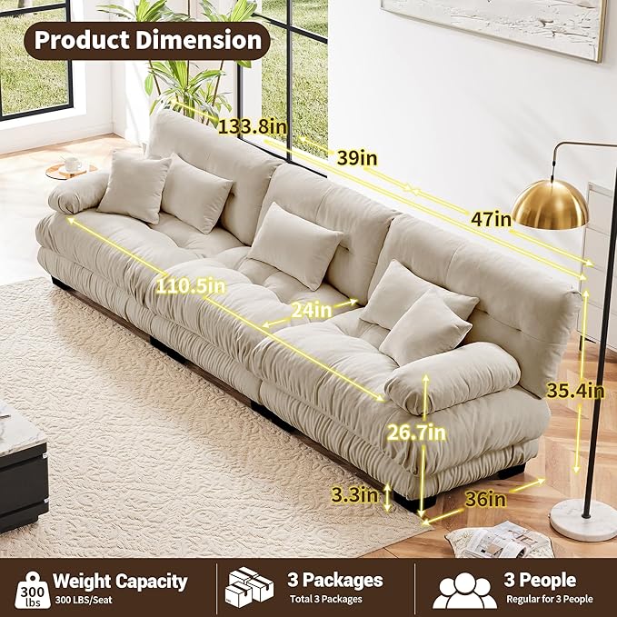 - Modular Sectional Sofa: This is an oversized sectional couch for living room. The 3-seater cloud couch is made of soft durable chenille fabric, it offers comfort and soft seating for everyone sitting on it. Exquisite round bolster armrest designs with well-filled inside provide comfort support for the hands, while sitting on it the bolster armrest can also provide your head with the appropriate radian and support