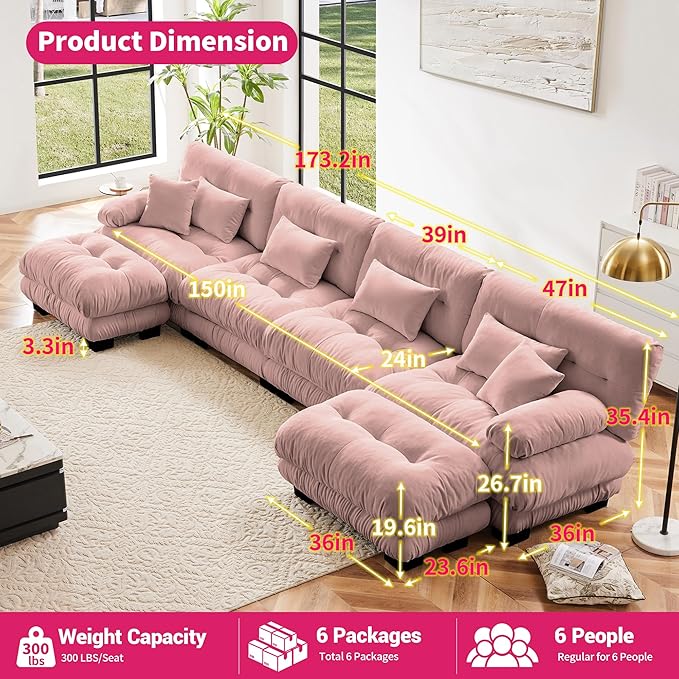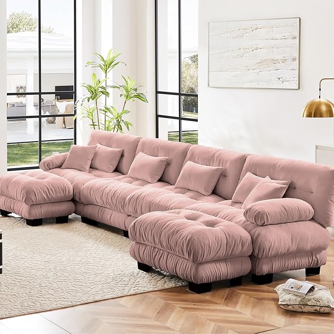 U Shaped Couch Sectional Couch, 4-Seater Cloud Couch Sectional Oversized Couch, Sofa Bed Couch with Round Bolster Armrests 6 Pillows, Modular Couch Home Sofa Living Room Couch(Pink)