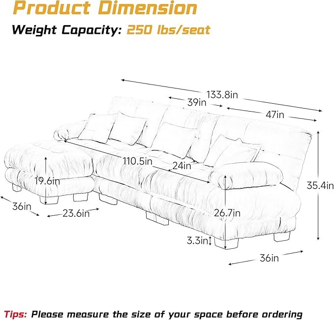 - Product Dimensions : 36"D x 133.8"W x 35.4"H