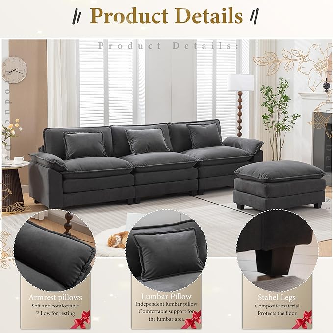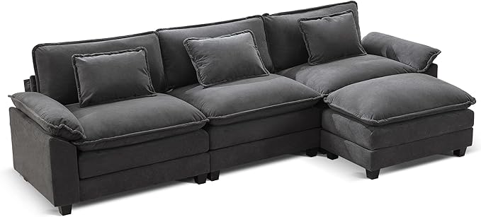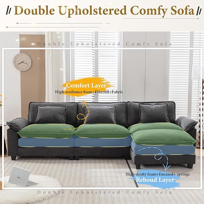 URRED Modular Sectional Sofa Comfy Cloud Couch, Modern Velvet Sofa Sleeper Deep Seat Couches with Ottoman/Pillows for Living Room (Dark Gray, 117''- L Shape)