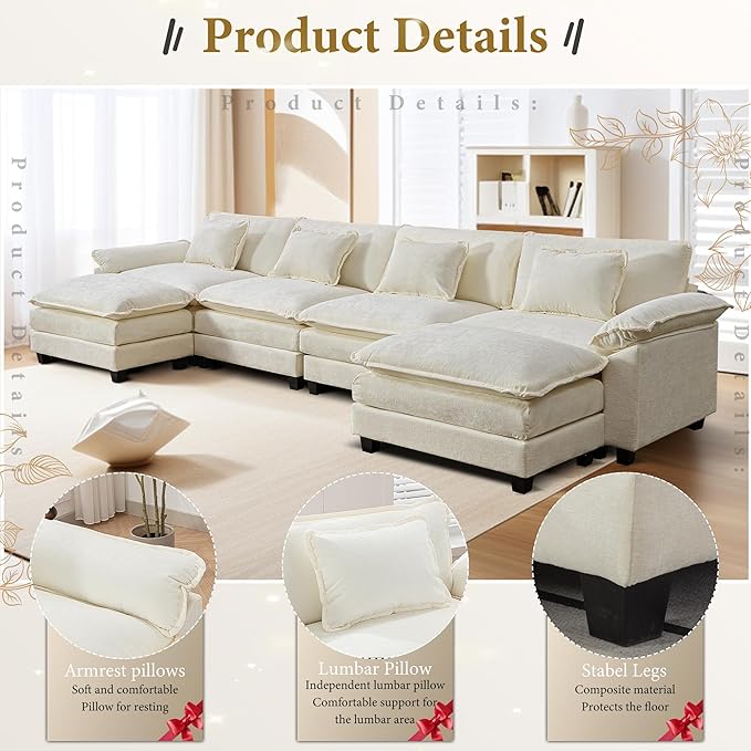 URRED Modular Sectional Sofa Comfy Cloud Couch, Modern Chenille Sofa Sleeper Deep Seat Couches with Ottoman/Pillows for Living Room (White, 154'' - U Shape)