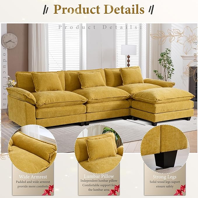 URRED Modular Sectional Sofa Comfy Cloud Couch, Modern Chenille Sofa Sleeper Deep Seat Couches with Ottoman/Pillows for Living Room (Yellow, 117''- L Shape)