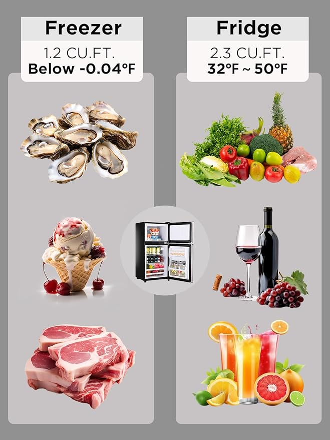 - Spacious 3.5 Cu.Ft Capacity: With 1.2 cu.ft in the freezer and 2.3 cu.ft in the fridge, this mini refrigerator offers ample space for all your favorite snacks, beverages, and frozen treats. Keep everything organized and within reach for your busy lifestyle.