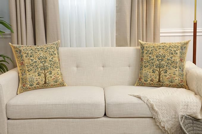 Charlotte Home Furnishings Throw Pillow Covers, Decorative Boho Pillow Covers for Couch, Light Tree of Life Square Cushion Cases 18x18 in, European Cotton Jacquard Woven for Cozy Bedroom Decor