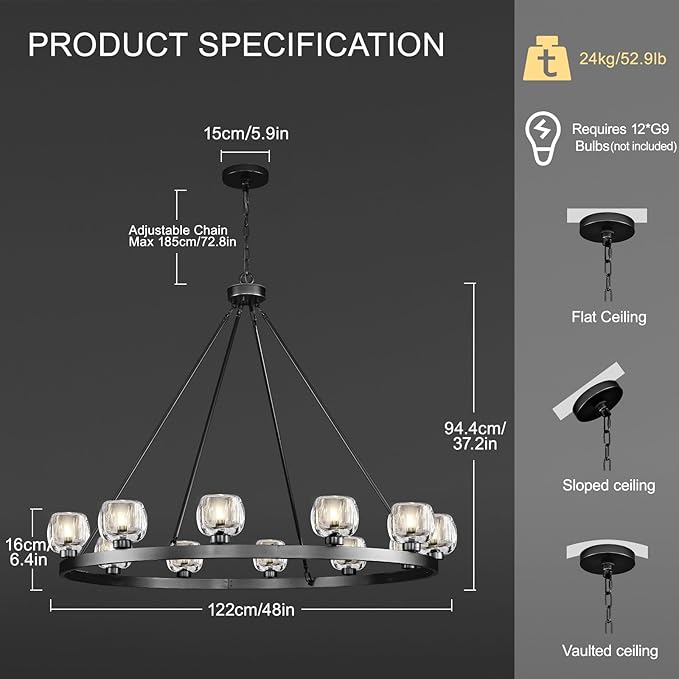 - 【12-Light Chandelier】Black wagon wheel chandelier offers 360° light coverage to brighten your space & create a cozy vibe. The round chandeliers for dining room requires 12 G9 bulbs and available for infinite dimming via a dimmer. (Dimmable bulbs & dimmer not included).