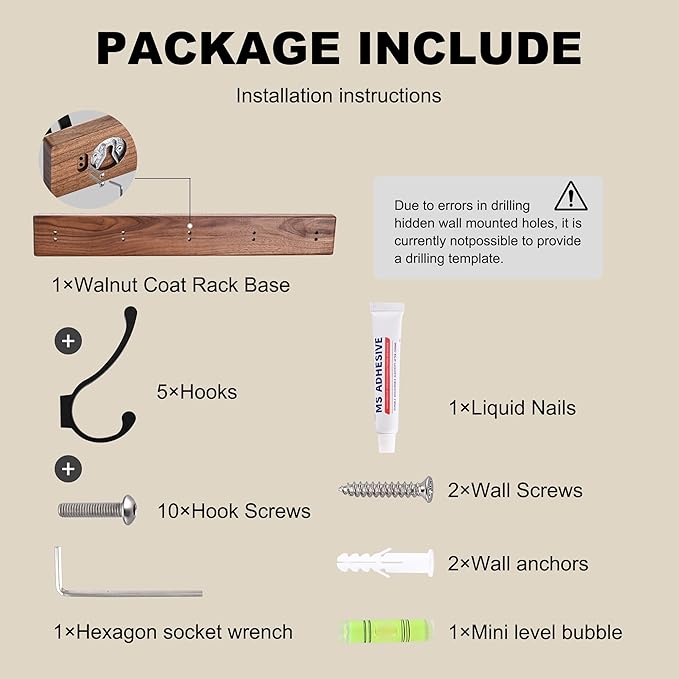 - [Easy to Install]: Due to manual punching, there may be 1-3mm error on the hole spacing. Before installation, please remeasure the hole spacing to ensure the best installation result. To maximize product protection during transportation, our hooks are not installed on a solid wood base and require manual installation. It's not advisable to use nail-free glue on painted surfaces as the adhesion between the coating and the wall isn't strong enough. Using it could cause the paint to peel off