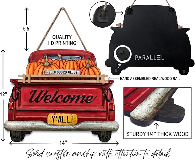 - Our seasonal welcome signs are not only beautiful to look at but are also versatile and easy to use. Change your front door decor instantly by swapping the seasonal decor sign on the truck. The truck has a hidden pocket slot behind the wood guard rail to hold it firmly in place.