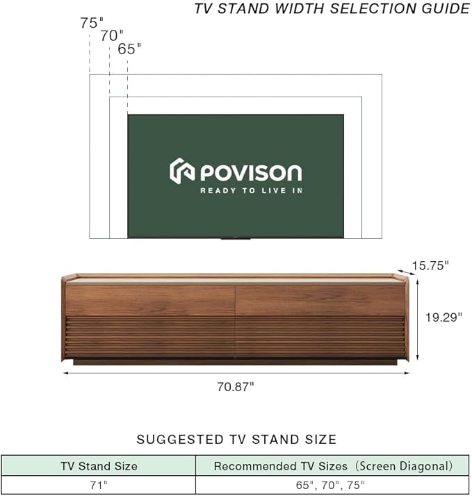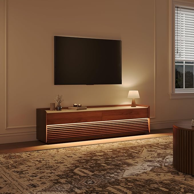 POVISON Fully-Assembled Mid Century Matte Sintered Stone TV Stand, 70.87" Wood Media Console with Adjustable LED Light, Entertainment Center with Storage for Living Room