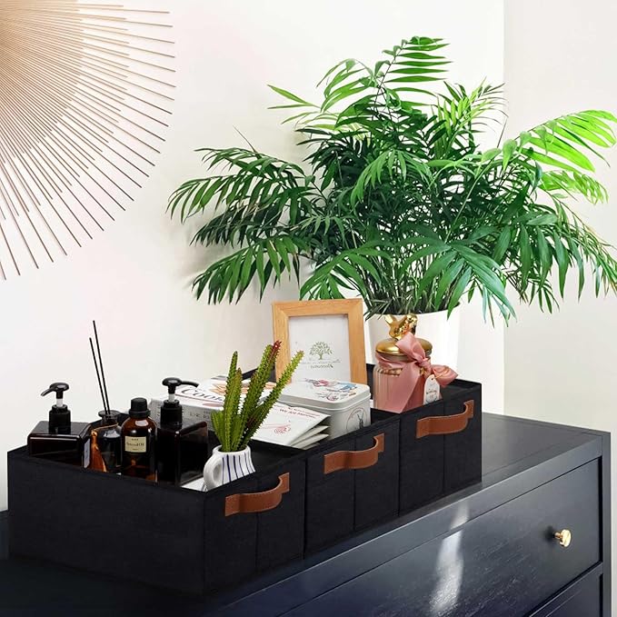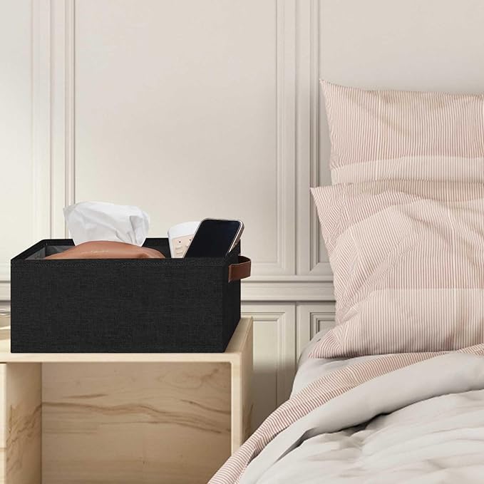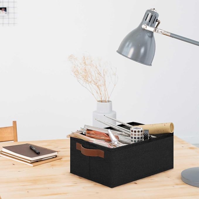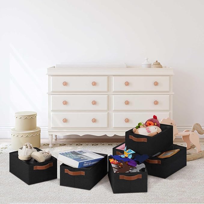 GhvyenntteS Small Fabric Storage Bins 6 Pack, 11.8" x 7.87" x 5.11" Storage Basket with Leather Handles, Closet Storage Bins for Shelves, Storage Baskets for Shelves, DVD Storage (Black)