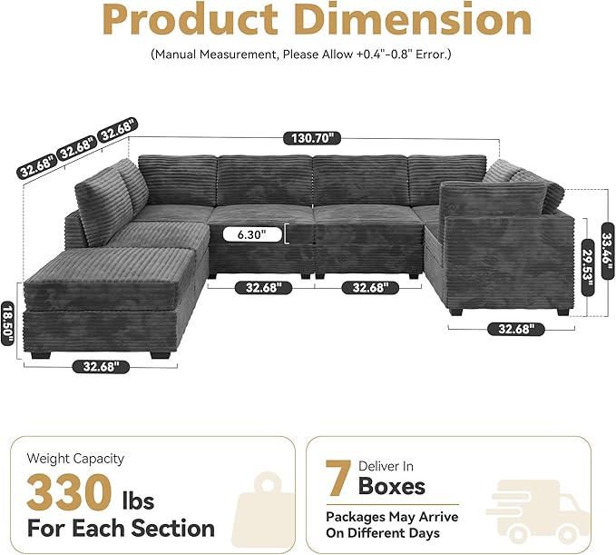 - One Package Per Seat:The modular sofa comes with 7 boxes and may arrive at different dates. Each box is designed and packaged to maximize shipping efficiency and fits narrow staircase and elevator. Armchair Size: 32.7" W x 28" D x 33.5" H; Ottoman Size: 32.7" W x 32.7" D x 18.5" H. Weight Capacity: 330 lbs / Seat. There may be slight color differences due to light or monitor.