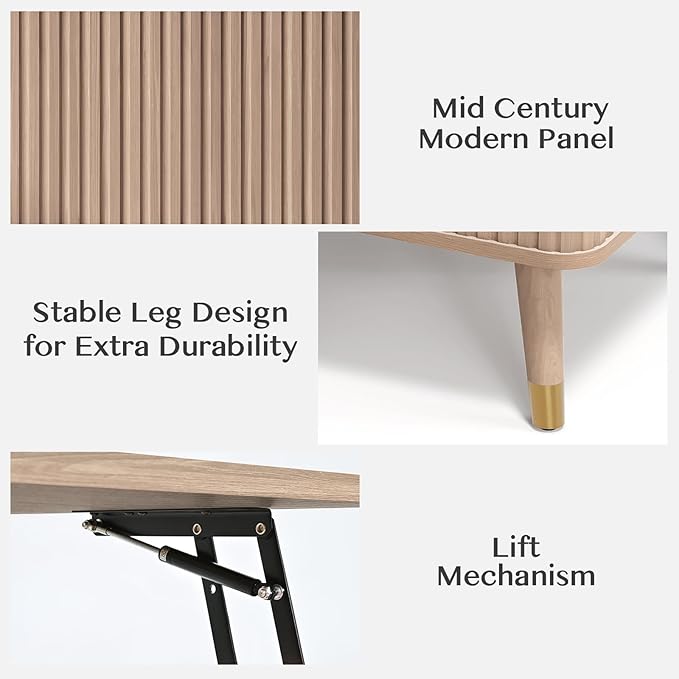 Lift Top Coffee Table with Storage Shelf & Hidden Compartment, Mid Century Modern Fluted Rectangle Dining Table for Living Room, Home Office, Natural Oak