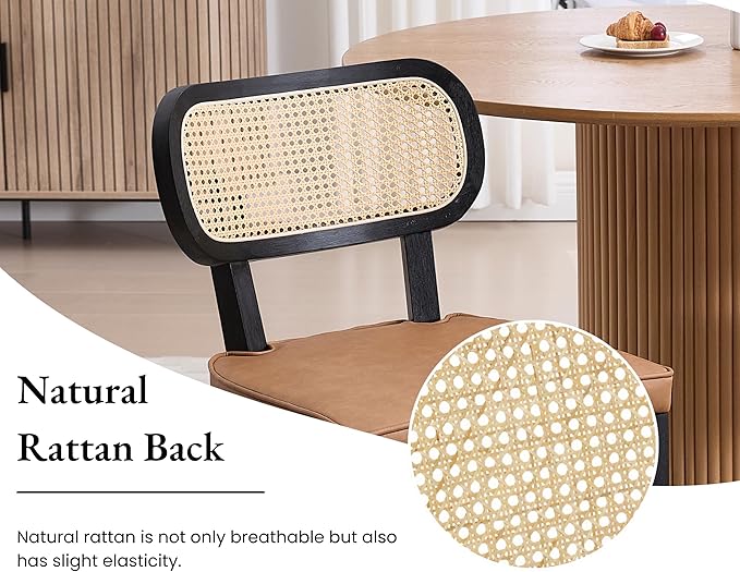 EALSON Mid Century Modern Rattan Dining Chairs Set of 4 Farmhouse Black Wood Kitchen Chairs with Cane Back Leather Upholstered Accent Armless Chairs for Dining/Living Room Restaurant, Brown