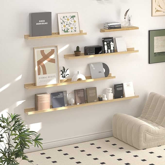 - Solid Wood Wall Shelves: These floating shelves are crafted from pine, which is sturdy and sustainable real wood, ensuring sturdiness and longevity to support various items without warping or sagging
