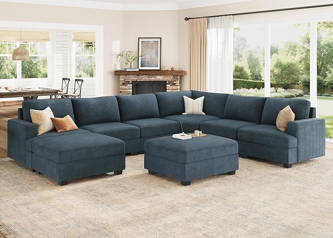 Nolany Sectional Sofa with Storage Ottoman, Corduroy Modular Sectional Couch, U Shape Sectional Couches for Living Room, Blue