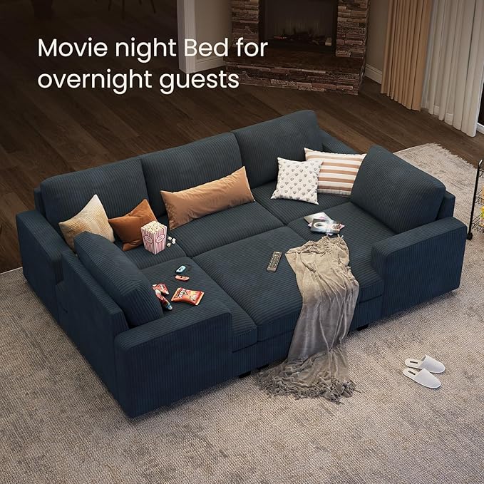 Nolany Modular Sectional Couch with Storage Ottoman, Corduroy Sleeper Sectional Sofa with Chaise, Sectional Couches for Living Room, Blue