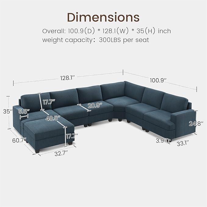 - Sectional size: 100.9(D)×128.1(W)×35(H) in, weight capacity: 330 lbs per seat