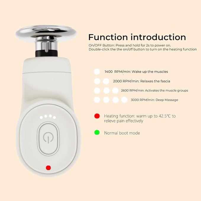 - 【Effective Rapid-Heat Massage Gun】 Equipped with a unique heat-conductive steel head, this deep tissue massage gun achieves 46°C/114°F in only 1 minute for enhanced relief from muscle tension and soreness. Operation: Enable heating by double-pressing the Power button (indicated by a red light). Do not use the silicone massage head when using the heating function.