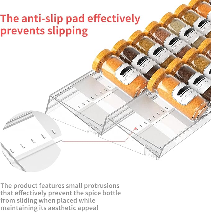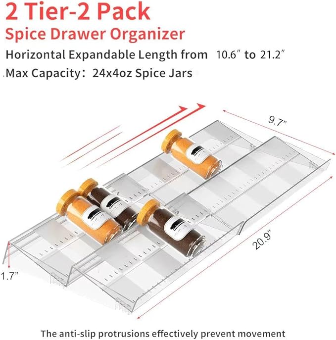 - 【Customize Your Spice Storage】 Optimize your kitchen with a spice rack that adapts to your needs. This expandable organizer fits drawers 10.63'' to 21.14'' wide. Choose the 2-Tier 2-Pack for shallow drawers or the 4-Tier 4-Pack for deeper storage. Featuring anti-slip silicone pads and raised acrylic ridges, it prevents spice jars from sliding, ensuring secure and stable storage.
