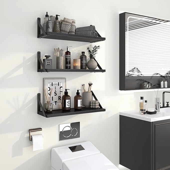 Heimlove Floating Shelves for Wall, 16 Inch Long Wood Floating Shelves Set of 3, Wall Mounted Hanging Shelf for Bathroom Bedroom Kitchen, Black