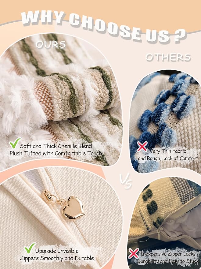 - INVISIBLE ZIPPER CLOSURE: Designed with a smooth heart invisible zipper, these cushion covers provide a seamless look while ensuring easy insertion and removal of pillow inserts. our high-quality zippers enhance durability and smoothness compared to ordinary zippers, ensuring struggle with a faulty zipper.