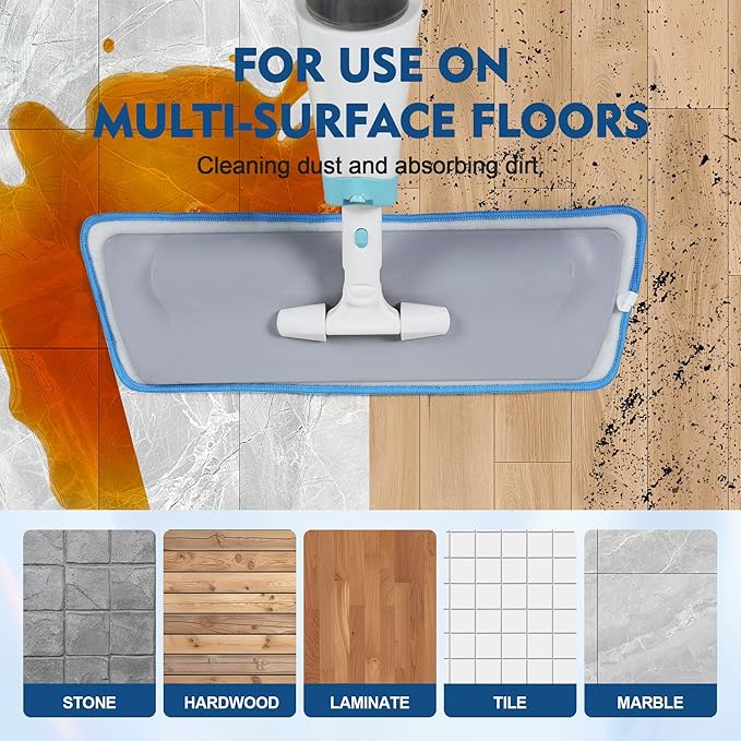 - Washable and Reusable Pads: The reusable spray mop pads are suitable for hardwood floor cleaning, tile floors, glass, laminate, ceramic, marble, etc. Both wet and dry are used for cleaning dust, hair, pet hair, and oil stains and absorbing water.