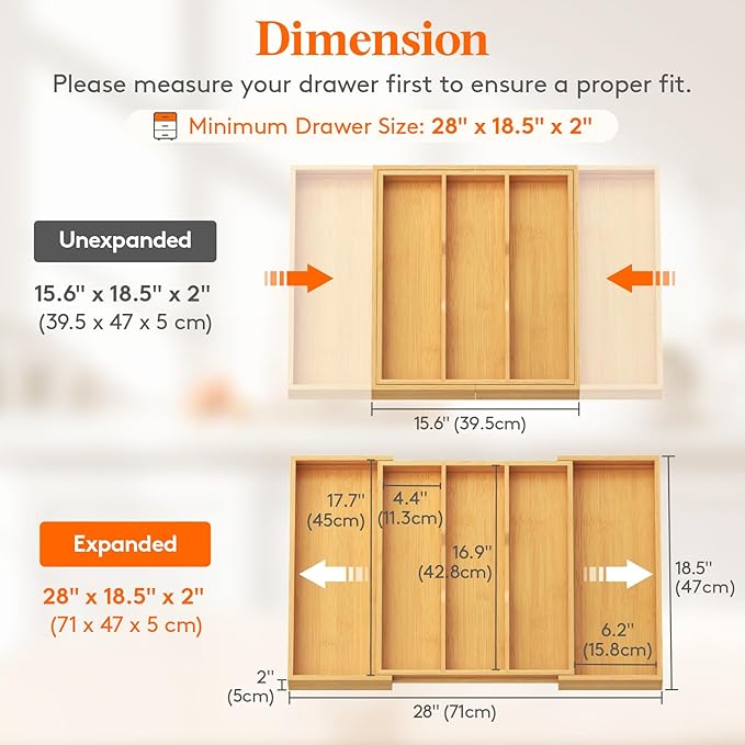 - Five Size Options: We offer five sizes of utensil drawer organizer to ensure a perfect fit for any drawer, ranging from 7 - 28 inches (17.8 - 71 cm) in width. Measure your drawer before purchasing to find the ideal size or combine multiple organizers for larger drawers