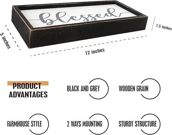 Rustic Blessed Freestanding Sign Home Decor for Living Room - Farmhouse Framed Blessed Wall Art Solid Wood Grey 12x5 Inches