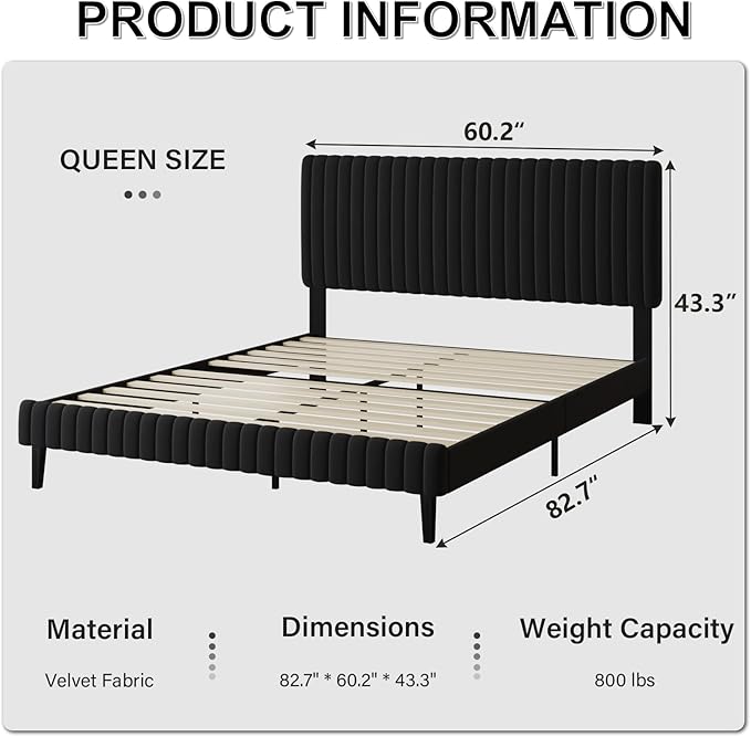 Queen Bed Frame, Velvet Upholstered Platform Bed with Vertical Channel Tufted Headboard, No Box Spring Required, Easy Assembly, Black