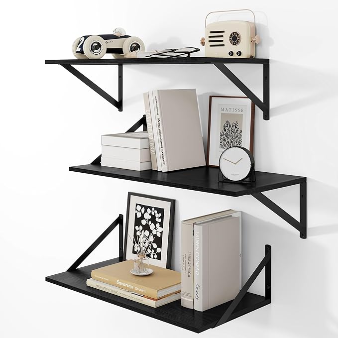 - Effortless 10-Minute Installation: All necessary hardware is included in the package. With pre-drilled mounting holes and detailed step-by-step instructions, these wide floating shelves can be securely installed in just minutes. Package Contents: 3 wooden boards (24" W x 12" D), 6 steel brackets, 13 anchors, 13 long screws, 13 short screws, 1 level, 1 installation manual.