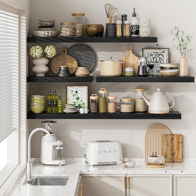 - Perfect Wall Decor: Handcrafted from premium 1.5" thick wood, our wood floating shelves boast a unique wood grain that infuses your space with timeless charm. Perfectly suited for any modern, traditional, rustic, or farmhouse decor, this shelf elevates the ambiance of your home and kitchen. With 5 colors and 4 sizes, you can creatively arrange your storage space with your style.