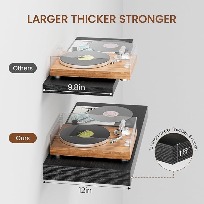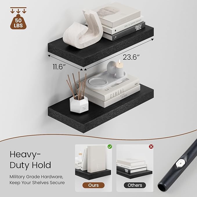 - Extra Deep Floating Shelves: Measuring 11.6” D x 23.6” W x 1.5” H, these shelves are crafted for maximum depth and durability. The spacious 12” depth gives you plenty of room for stylish display, organized storage, and decorative accents. Perfectly suited for your bathroom, kitchen, or living room, they enhance both function and flair in any space!