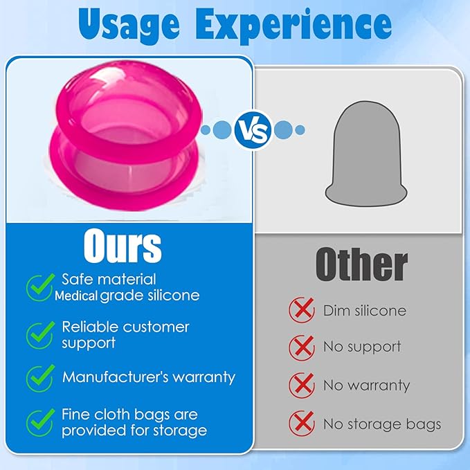 - Include 15pcs Massage Silicone Cups: 2pcs-Extra Large Cups (3.9”x 3”),4pcs-Large Cups (3”x2.2”), 4pcs-Medium Cups (2.4”x1.8”), 5pcs-Small Cups (1.8”x1.4”), A delicate flannel bag, Easy to store those cups.
