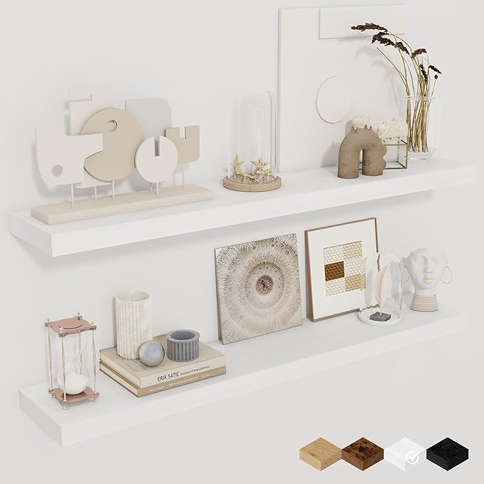 - STYLE & VERSATILITY: Elevate your home with our set of 2 elegant wall shelves, designed for versatile display options. Arrange them side by side for a clean, unified look, or stagger them for a bold, dynamic effect. Adding a touch of sophistication while providing practical storage