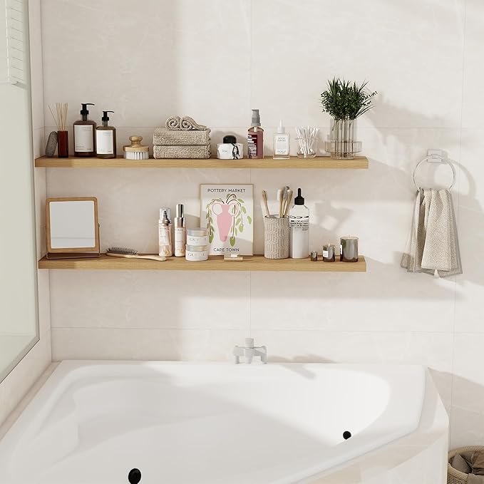 - Multi-Scene & Functional: These versatile shelves are great for any room. Use them in the bathroom for beauty products or aromatherapy, in the bedroom for books and personal items, or in the kitchen for spices and jars. They also make a stylish display shelf in the living room for photos, trophies, or collectibles. Perfect as floating bookshelves, over-the-toilet storage, kitchen shelves, or wall displays throughout your home