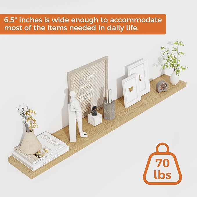 - 48-Inch Floating Shelves for Wall (Set of 2): Each shelf measures 6.5 inches in depth and 1.1 inches in thickness. This 2-piece set offers a more cost-effective and practical storage solution. Fun Memories wall shelves can be installed in a variety of ways—staggered vertically, side-by-side, or independently—to add extra storage and reduce clutter in your kitchen, bathroom, bedroom, and more. Available in multiple colors to suit different decor styles