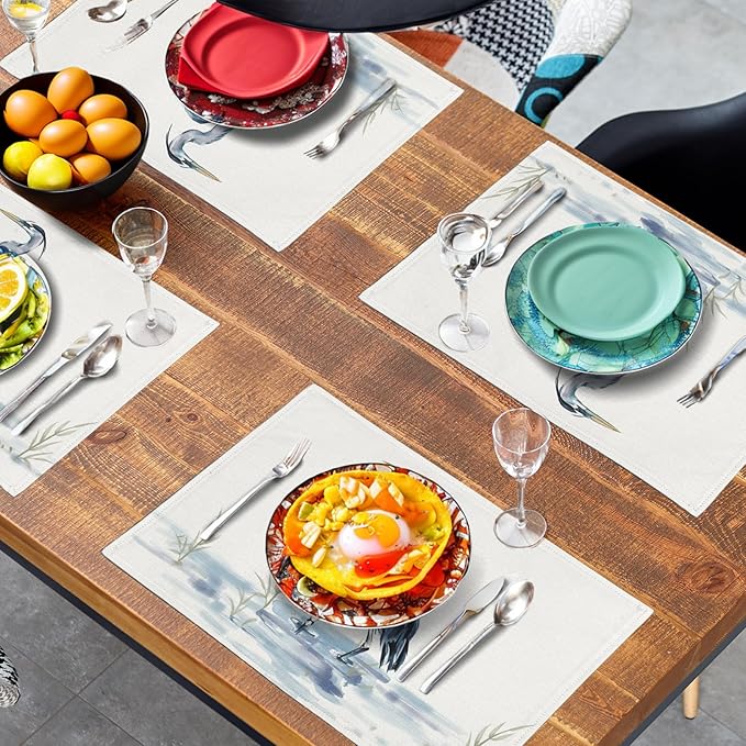- TABLE DECORATION: Summer coastal placemat feature high-definition printing technology for crisp, clear patterns and vibrant colors; rectangle placemats with a heron pattern; unique and eye-catching seasonal patterns add charm to farmhouse table place mats, creating a spring and summer atmosphere for your party