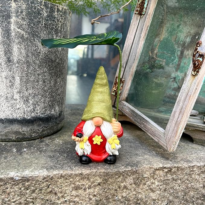 - DESIGN FEATURES: Charming garden gnome figurine wearing a red outfit with yellow flower accents, topped with a distinctive green pointed hat