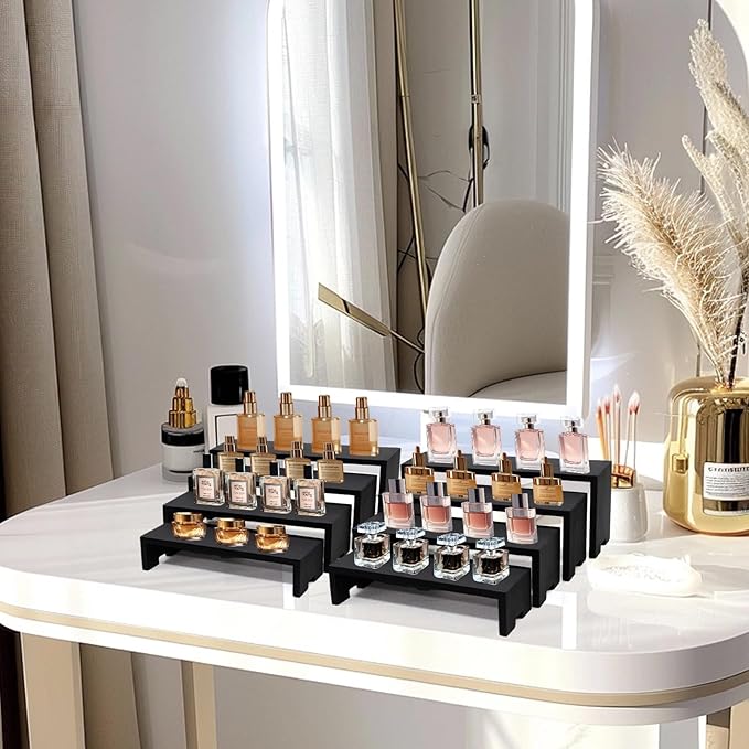 - 【Large Wooden Tierd Risers for Display】🎁: This 2 set 4 tier display shelf for cupcakes or vendors has stackable nesting design, so the wooden display risers easily access as desktop storage racks,also they has strong load-bearing capacity for more kinds perfumes, collectible figures,kitchen condiment bottles, bathroom toiletries because of varieties size of (L8.6''/22cm-9.4''/24cm-10.2''/26cm-11''/28cm)XW3.14'' /8cm