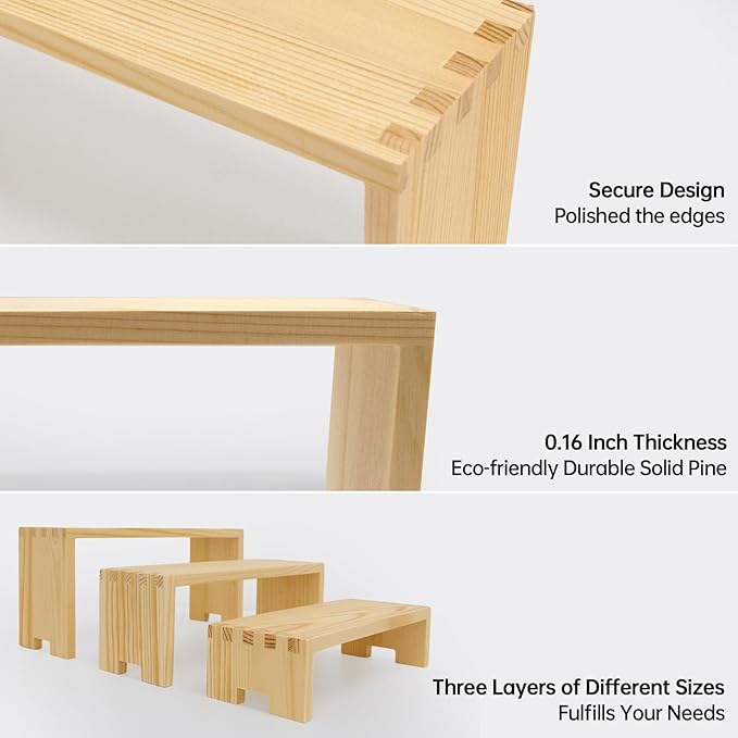 - 【Tierd Display Stands for Vendor】🎁: First they are no need any tools then can be used directly! very convenient to display more items for vendors, they are not only beatiful but also improve space utilization rate, U-shaped wood risers, fire-carbonized, durable, non-toxic, odorless, and no deformation, nested design for easy storage in living room,bedroom,kitchen,indoor,outdoor, also can be used individually or as a set.