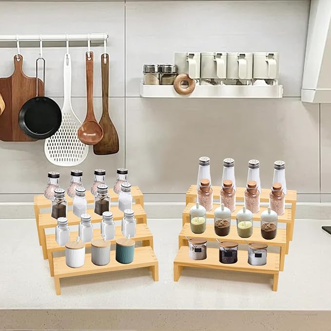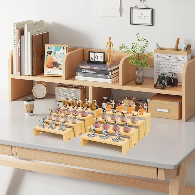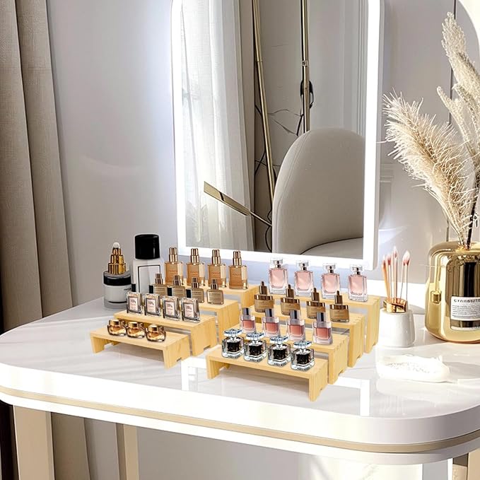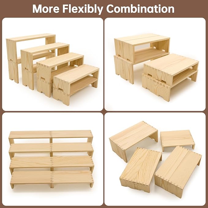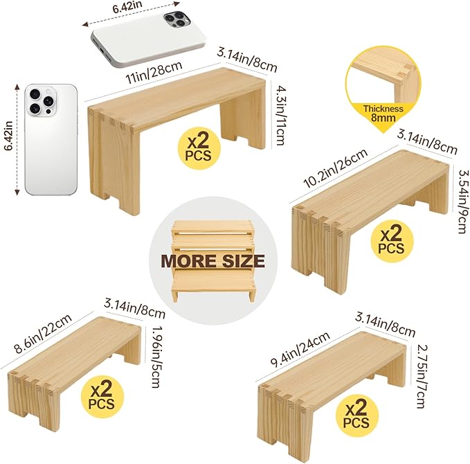 - 【Large Wooden Tierd Risers for Display】🎁: This 2 set 4 tier display shelf for cupcakes or vendors has stackable nesting design, so the wooden display risers easily access as desktop storage racks,also they has strong load-bearing capacity for more kinds perfumes, collectible figures,kitchen condiment bottles, bathroom toiletries because of varieties size of (L8.6''/22cm-9.4''/24cm-10.2''/26cm-11''/28cm)XW3.14'' /8cm