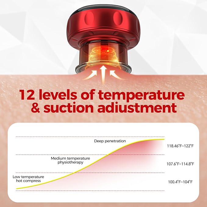 - 【12-Level Adjustable Temperature & Suction Control】Say goodbye to one-size-fits-all cupping! Our cupping kit for massage therapy lets you fine-tune suction strength (1-12) and heat (100°F-122°F)—from gentle warmth for stiff necks to firm grip for deep muscle knots. Cold mornings? Crank up the heat. Sensitive skin? Lower the suction. Your comfort, your call