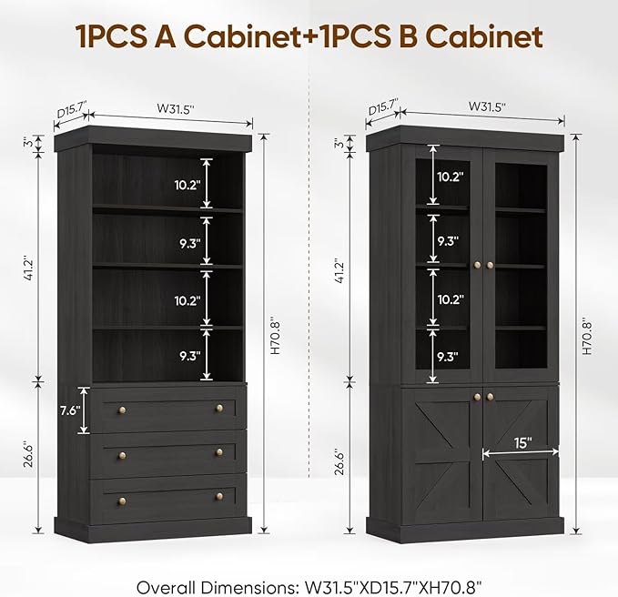 Vyre 71" Tall Farmhouse Bookshelves with Glass Doors and Drawers, Set of 2 – Large Modular Bookcase with Adjustable Shelves, Storage Cabinet for Living Room, Kitchen, Black