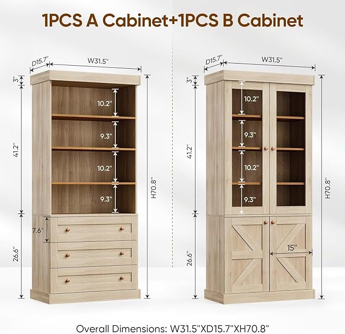 - 【Ample Storage with Adjustable Shelves】 Measuring 31.5"W x 15.7"D x 70"H, this bookcase offers adjustable shelves, a spacious bottom compartment, and your choice of glass doors or drawers. It’s perfect for storing books, decor, and everyday essentials, blending functionality with elegance.