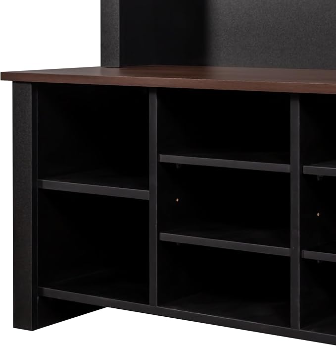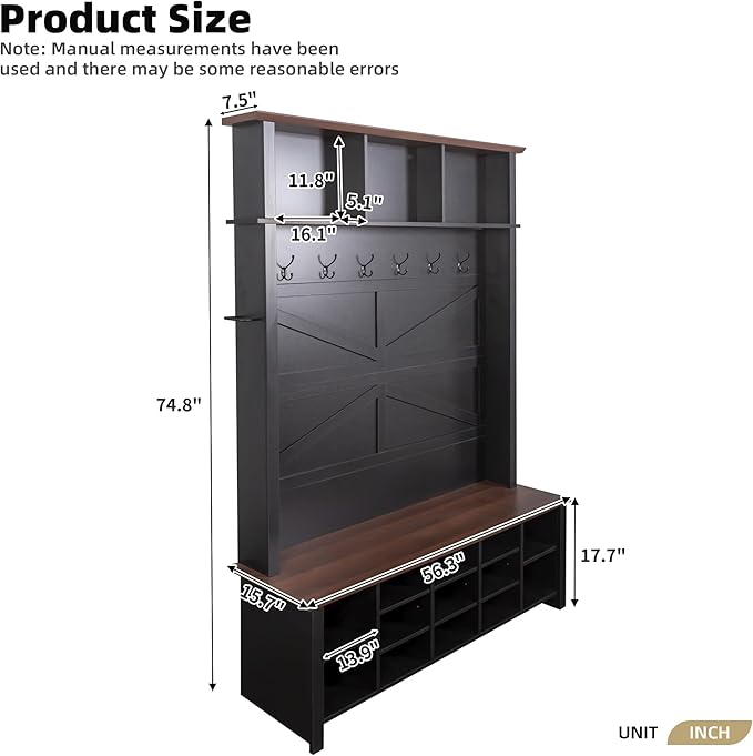 Ball & Cast 4-in-1 Hall Tree with 6 Hooks,Walnut Entryway Bench with Adjustable Shelves,Rustic Shoe Organizer with 16 Open Compartments,for Mudroom,Living Room,Hallway,Black