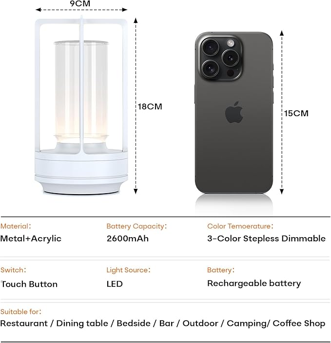 - 💚 [ A perfect gift idea ]: Our touch light lamp can match a variety of scenes and styles while making a great gift. It can be used as an ambient light for Thanksgiving, Christmas and birthday parties. The rechargeable cordless led table lamp is suitable for bedroom, bedside table, office, restaurant, cafe, bar, hotel, outdoor patio lighting, etc.