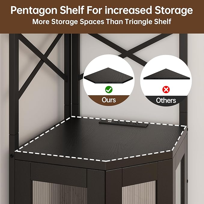 - 【Corner Bar Cabinet with Charging Station】 This corner cabinet features 3 power outlets & 2 USB ports, allowing you to conveniently charge coffee makers, blenders, phones, and bar accessories—no extra power strips needed! The 4.9FT cord provides flexibility, making it perfect for your home bar, kitchen, or living room. A must-have bar stand for home with smart functionality!