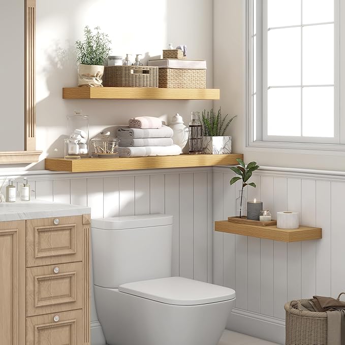 Heimlove 24 inch Floating Shelves for Wall,9.3 inch deep Bathroom Over Toilet Shelf,Wall Mounted Rustic Wood Shelves for,Bedroom,Living Room,Kitchen,Office Decor Set of 2-Oak Color